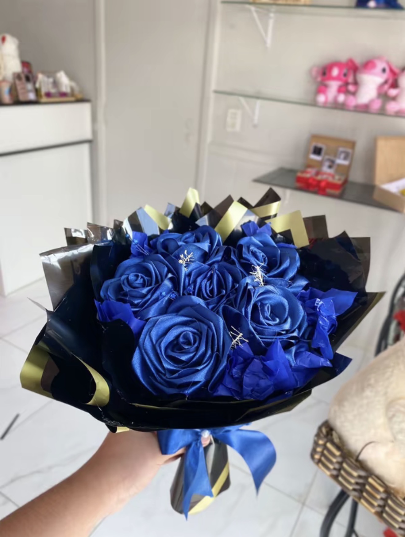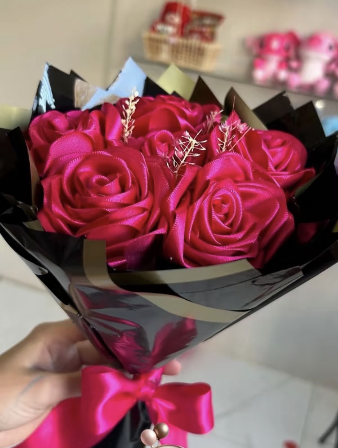 Buque de 6 rosas de cetim com laco para presente elegante e romantico